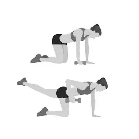 From a quadruped position, straighten one leg so that it is parallel to your back. To engage your core and glutes, perform a row with the opposite arm by lifting the weight towards your body. Slowly lower your arm and leg. Try these for 8-12 repetitions and repeat 2x.
