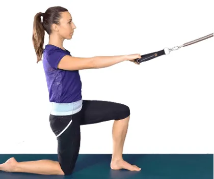 In a half-kneeling position, pull the resistance band or cable down towards the kneeling leg. Maintain stability by engaging the glutes and pushing the heel of your front leg into the ground. Again, try to complete these for 8-12 repetitions and repeat 2x.